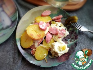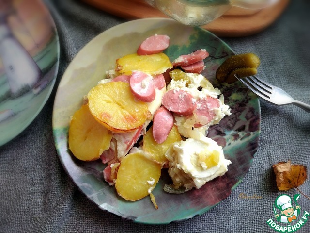 На яйца - порезанные сосиски. Последний слой - вторая половина картофеля. Делаем заливку. В посуду наливаем молоко, разбиваем яйцо, добавляем сметану и соль по вкусу. Вилкой соединяем и заливаем форму с содержимым. Заливка не должна быть густой. Ставим в духовку, выставив Т-180 С на 25-30 минут.