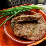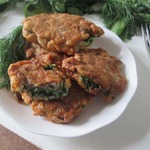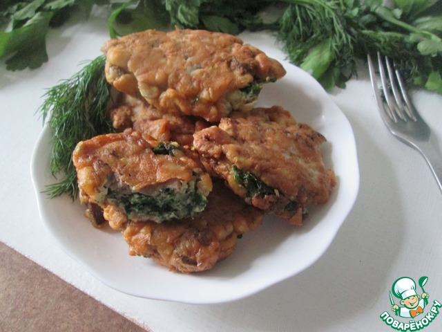 Печеночную массу выкладываем на сковородку с разогретым растительным маслом, по 1 ст. л., сверху кладем зелень около 1 ч. л. На зелень выкладываем снова по 1 ст. л. печеночной массы.