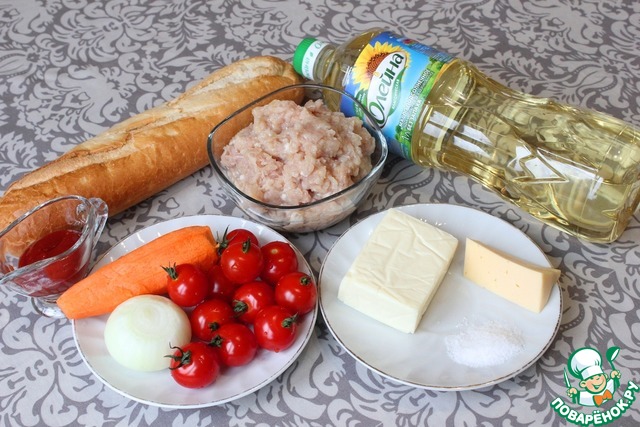 Ингредиенты для «Багет, запечённый с фаршем и черри»: