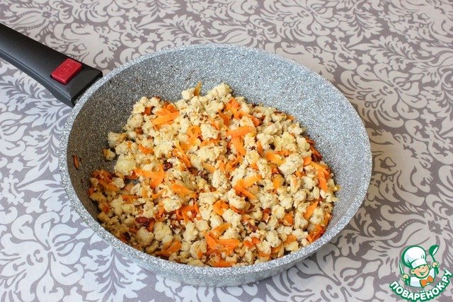 В разогретую сковороду вливаю подсолнечное масло. Кладу мясной фарш. Добавляю натёртую на крупной тёрке морковь и нарезанный лук. Обжариваю на среднем огне до готовности фарша.