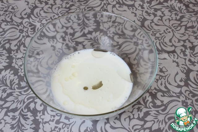 В глубокую миску вливаю белок яйца (желток убираю в холодильник). Вливаю подсолнечное масло, добавляю соль и сахар. Молоко чуть-чуть подогреваю и также вливаю в миску.
