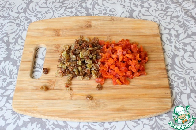 Изюм и курагу тщательно промываю и обсушиваю. Курагу режу мелкими кусочками.