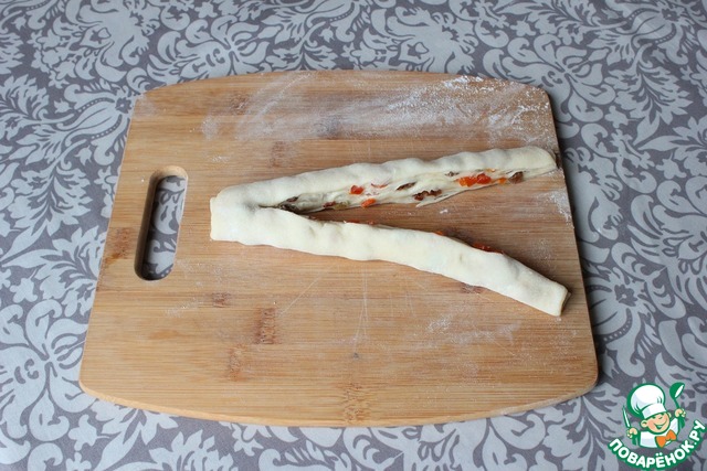 Сворачиваю тесто в рулет (по длинной стороне). Ножом делаю по середине разрез (но не до конца).