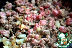 Начинка любая, даже сладкая. Я очень люблю такого типа пироги на нежным тесте с капустой. Готовила как-то с капустой тушёной и черносливом-очень празднично и вкусно. Сегодня по заявкам мужа добавлю мясо, этакий мужской каприз. Начинку можно приготовить заранее, да она сама по себе получилась самодостаточно-вкусная.