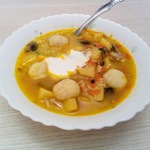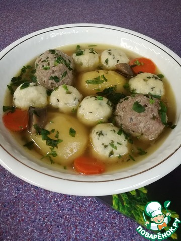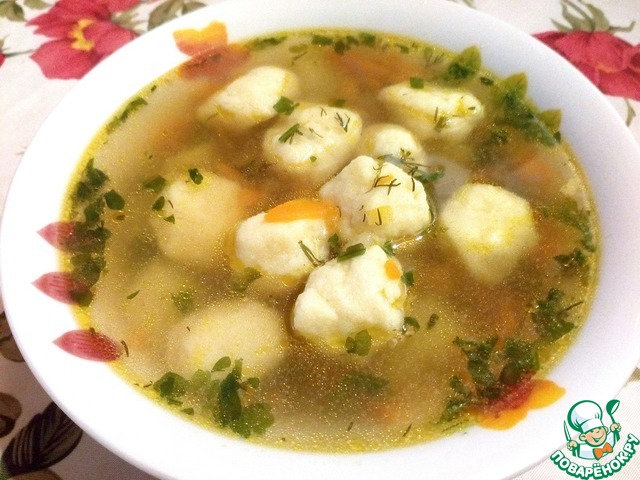 Как только суп закипел, опускаем в кастрюлю заранее подготовленные галушки (выкладываем по одной). Аккуратно перемешиваем, чтобы они не пристали ко дну. Варим при небольшом кипении около 10 минут. В этот момент можно добавить в суп ваши любимые приправы и подсолить, если нужно. Суп готов, он получился вкусным и наваристым, с мягкими аккуратными круглыми галушками.
