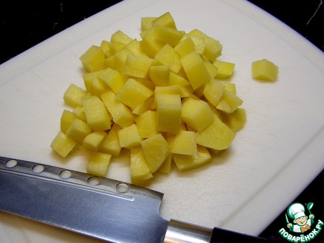 В кипящий бульон кладем картофель, нарезанный кубиками.