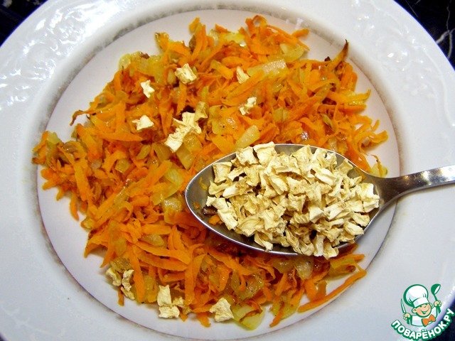 Из моркови и лука делаем зажарку и добавляем в бульон. Если у вас есть свежие белые коренья (сельдерей, петрушка, пастернак), их хорошо бы тоже положить в зажарку – суп будет намного ароматнее. У меня был сушеный корневой сельдерей, который я добавила сразу в суп.