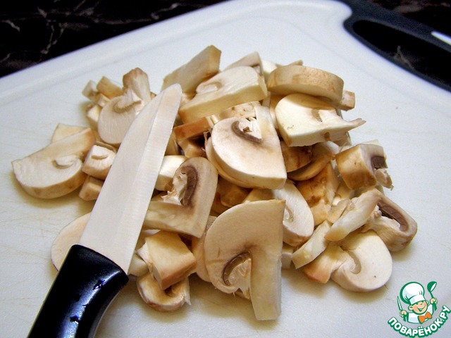 Нарезаем шампиньоны и кладем в кастрюлю. Огонь не увеличиваем, ждем, когда суп снова закипит.