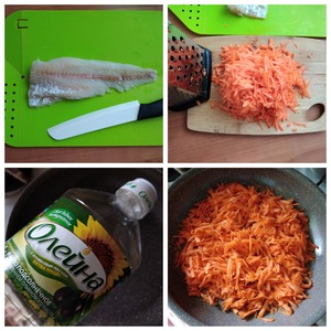 Я возьму филе минтая и нарежу его на кусочки шириной~3 см. Очень хорошо для детей и пожилых. Можно рыбку взять кусками на кости. Натираем морковь на средней тёрке. Наливаем масло на сковороду и греем его. Выкладываем морковь натёртую. Мне нравится много моркови, она будет очень вкусная, как дополнение к гарниру. Морковь томим под крышкой, присолив щепоткой соли, почти до готовности. Лук нам в этом рецепте не нужен, в заливке будет чеснок.