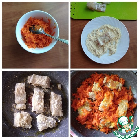 Перекладываем в посуду и на этой же сковороде обжариваем немного кусочки минтая, обваляв их в муке, с обеих сторон. Выкладываем к минтаю морковь на сковороду.