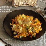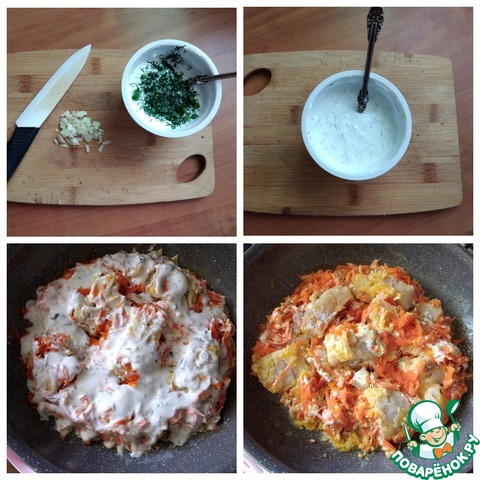 Делаем заливку. Рубим мелко укроп и чеснок, отправляем в сметану, солим по вкусу и перемешиваем. Заливаем минтай с морковью и тушим минут 10. Готово!