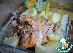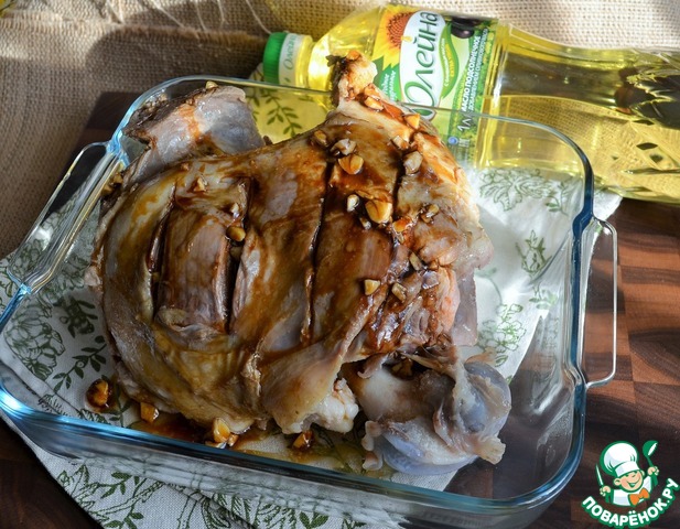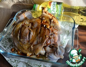 Варёную ногу переложить в огнеупорную форму, сделать неглубокие надрезы, промазать чесночно-масляной смесью.