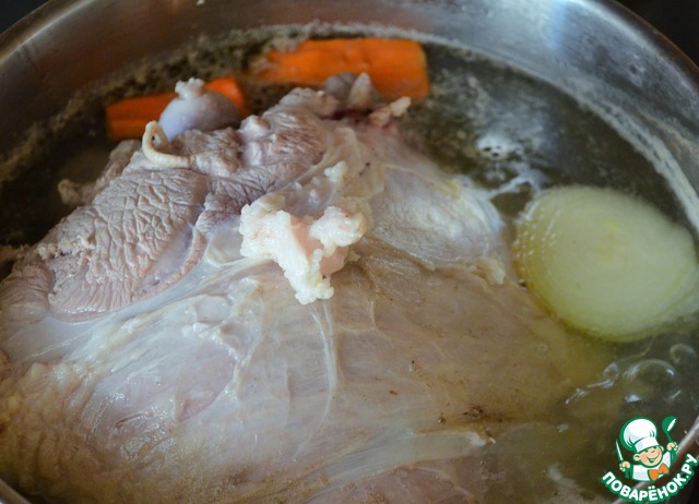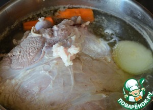 Залить холодной водой, добавить ломтик моркови, лука, дать закипеть, удалить пену, огонь убавить, слегка посолить и варить на медленном огне, 1-1,5 часа, до готовности.