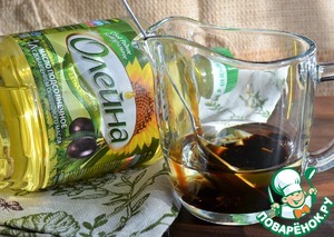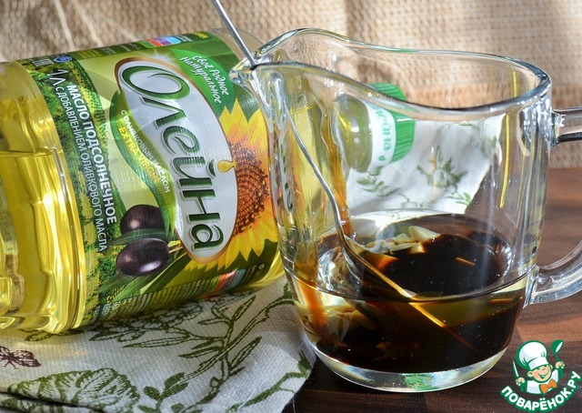 Смешать мелассу (патоку или мёд), растительно-оливковое масло и рубленый зубчик чеснока.