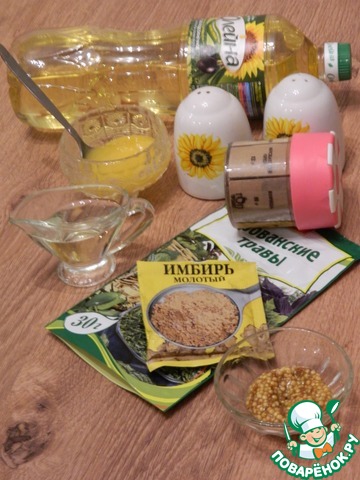 Смешаем мед, горчицу, смесь трав, мускатный орех, имбирь, растительное масло и соевый соус.