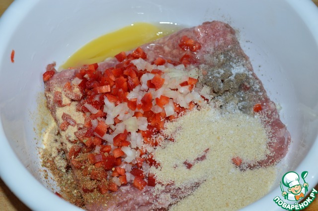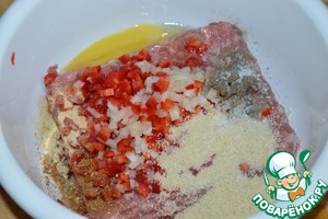 Смешать фарш, яйцо, измельченные овощи, панировочные сухари и специи.
