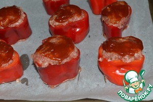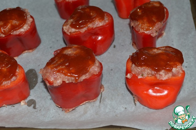 Смешать кетчуп и коричневый сахар, смазать поверхность перцев.