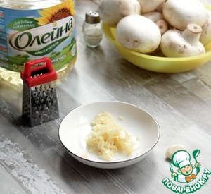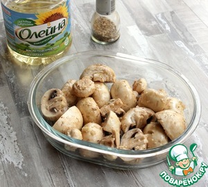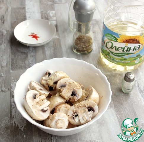 Подготовить все ингредиенты. Шампиньоны обтереть влажной салфеткой, крупные нарезать пополам или на 4 части.