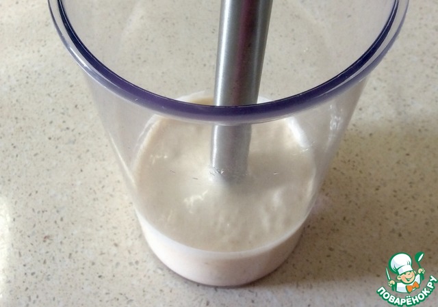 Погружной блендер ставим в стакан и включаем на среднюю мощность, не отрывая его ото дна первые несколько секунд. Начать приподнимать можно лишь когда образуется белая масса.