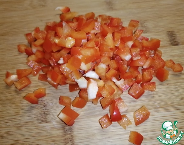 Перец нарезать небольшими кубиками. Посыпать на картофель.
