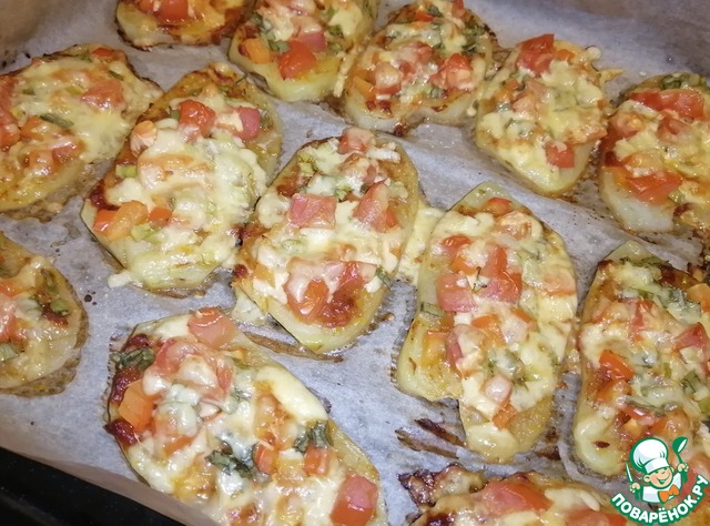 Аккуратно сделать косые надрезы, чтобы не разрезать до конца картофель и получились квадратики.