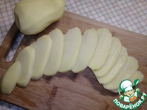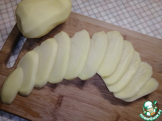Картофель нарезать тонкими пластинками.