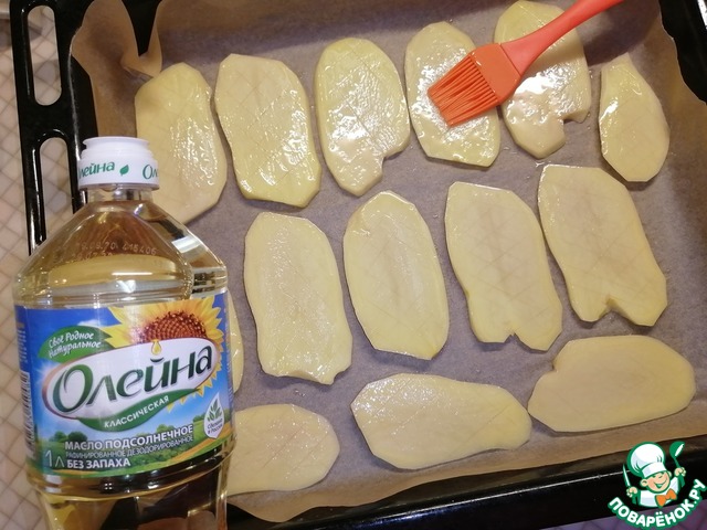 Противень застелить пекарской бумагой. Разложить картофель. Посолить по вкусу. Смазать подсолнечным маслом.