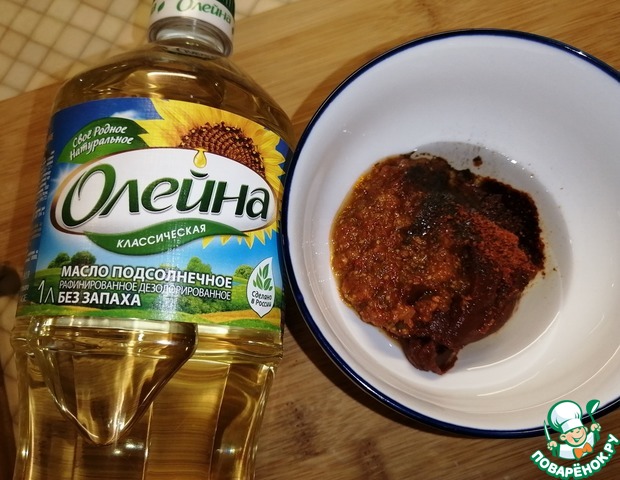 В небольшой миске хорошо смешать томатную пасту, томатный соус (у меня в этот раз домашняя аджика из помидор), паприку, перец и 2 ч. л. подсолнечного масла.