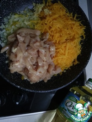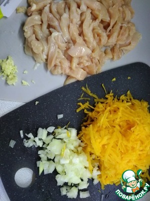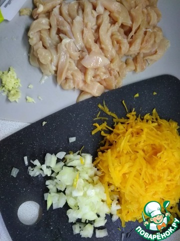 Куриное филе нарезать на полосочки. Тыкву натереть на тёрке. Чеснок и лук мелко порезать.