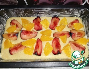 В форму 13х24, смазанную маслом, выложить бОльшую часть теста, сверху в произвольном порядке разложить вымытые, обсушенные, лишённые косточек и разрезанные на четыре части сливы, кожицей вниз. Апельсин очистить, нарезать кусочками и раскидать рядом со сливами.