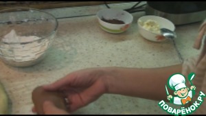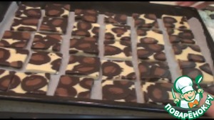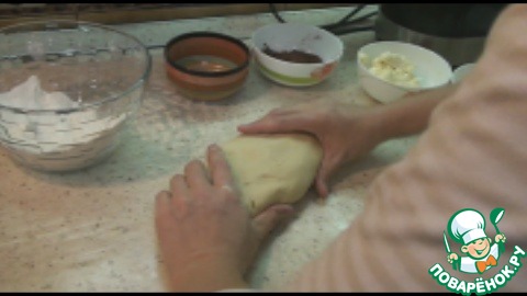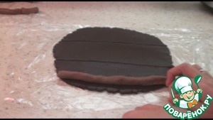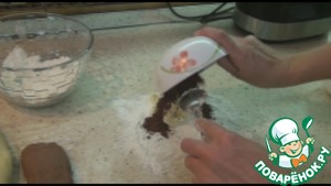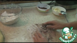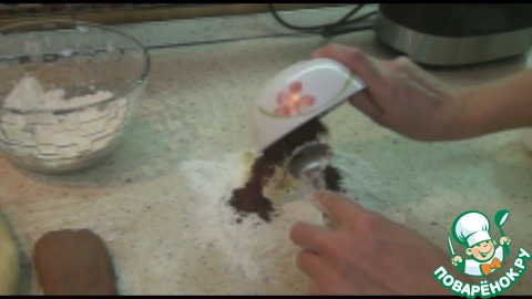 В оставшуюся смесь добавляем 3 ст л какао, муку и замешиваем тесто. Оно должно получится темно-коричневого цвета. Тоже формируем продолговатую полоску.