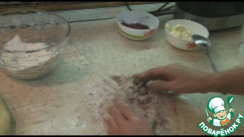 Берем самую меньшую часть масляной смеси, добавляем туда 1 ст л какао, на стол насыпем муку, выкладываем смесь и замешиваем тесто. При необходимости добавляем муку. Должно получится светло-коричневое тесто.