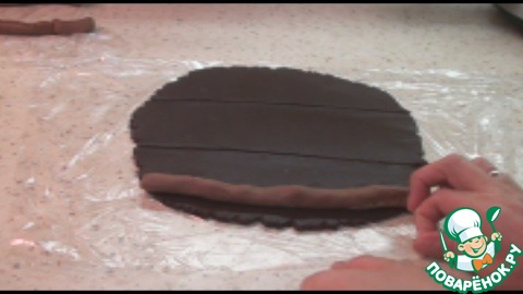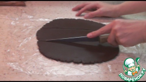 Достаем средний кусок теста, выкладываем его на пленку, накроем пленкой, так легче будет раскатать и раскатываем толщиной 5 мм. Разрезаем на три равные части.