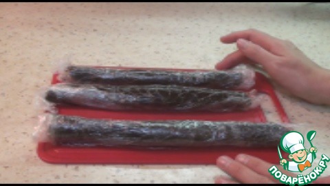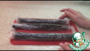 Потом этот рулет заворачиваем в пленку и формируем аналогично ещё два. Отправляем их в морозильную камеру на 15 минут.