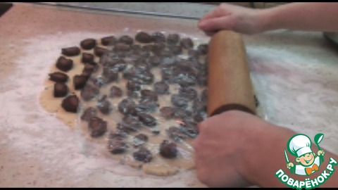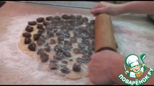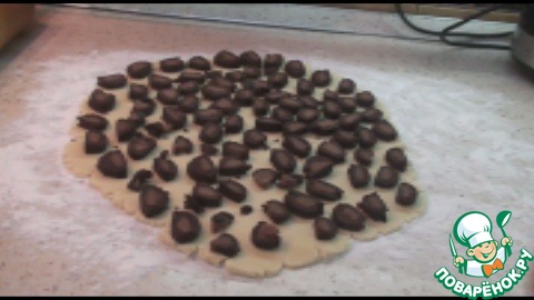 Достаем из камеры колбаску и нарезаем её толщиной 5 мм. Выкладываем кусочки на раскатанное тесто. Если отпадают крошки, тоже выкладывайте на тесто, оно потом раскатается и будет красиво.