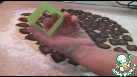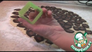 Берем любую вырубку, мне больше всего понравилась квадратная, получается безотходное производство, но и круглое и сердечки тоже красивые получились, так что берите, что у вас есть и выдавливаем печенье.