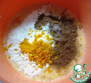 Добавить муку, щепотку соли, какао, разрыхлитель теста и цедру мандарина.