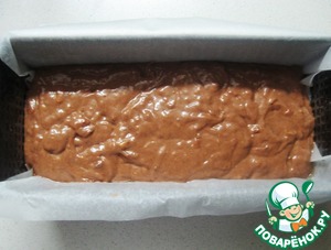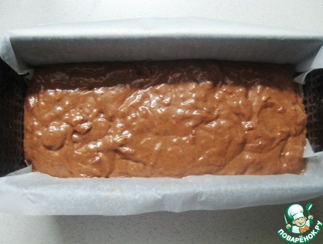 Подготовить форму для кекса (застелила пергаментом и чуть смазала растительным маслом, размер формы шир.11 см, выс. 7 см, дл. 25 см), выложить тесто.