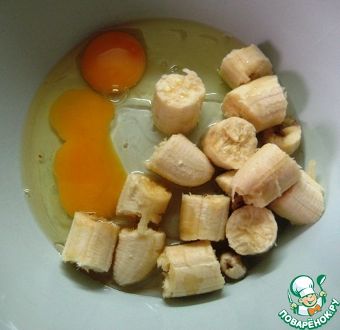 В миске соединить кусочки очищенного банана, растительное масло и яйца.