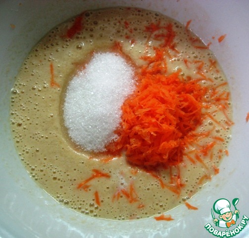 Добавить натертую морковь, щепотку соли и сахар. Перемешать.