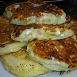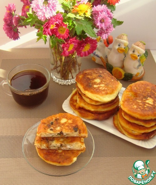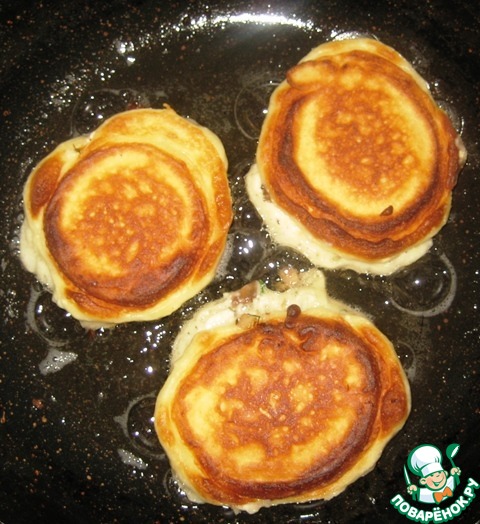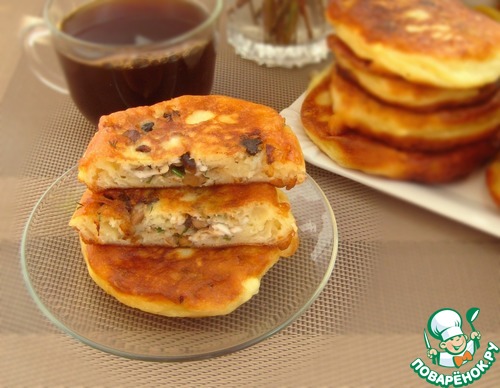 Сытные, румяные творожные оладьи с начинкой из грибов, адыгейского сыра и зелени!