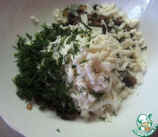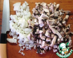 Для начинки: мелко нарезать лук и грибы. Обжарить на небольшом количестве растительного масла, дать остыть.