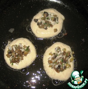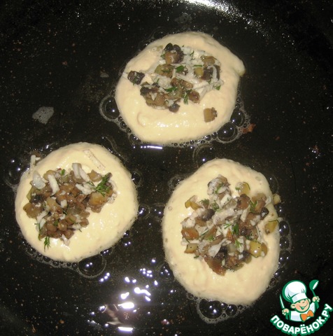 Разогреть на сковороде растительное масло, выложить ложкой тесто (примерно по 1 ст. л.), сверху в центр положить грибную начинку (примерно 1 ч. л.).