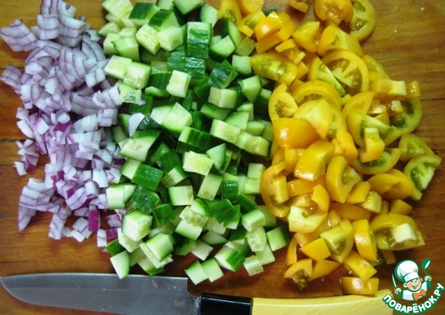 Мелко нарезать лук, огурец и помидоры нарезать небольшими кусочками (лучше использовать мелкие помидоры или же помидоры-черри, у меня желтые помидоры Сливки), сложить в удобную для перемешивания салата посуду.