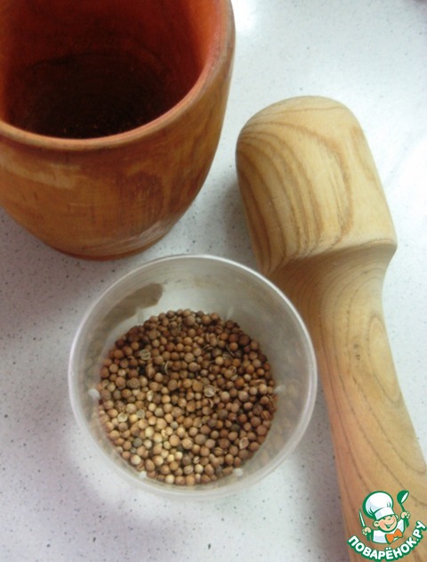 В ступке измельчить зерна кориандра.