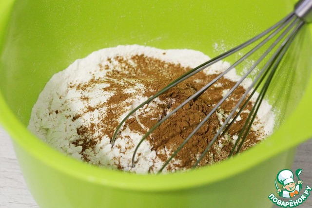 Муку с содой и разрыхлителем просеять в миску, добавить корицу и тертый мускатный орех, как следует перемешать венчиком.