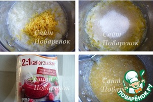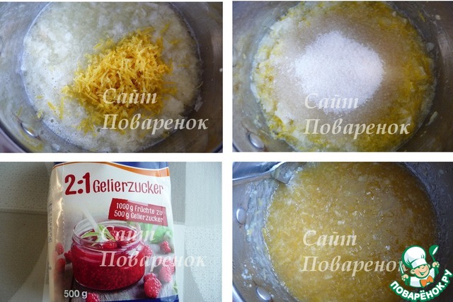 Добавить цедру лимона и сахар для приготвления желе. Сотейник поставить на огонь. После закипания варить на среднем огне 4мин., периодически помешивая. Остудить, залить в баночку.