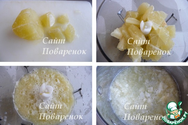 Мякоть лимона нарезать небольшими кусочками, удалить белые пленки и косточки, сложить в блендер, измельчить. Мякоть перелить в сотейник.
