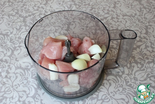 В чашу блендера кладу куриное филе, порезав его крупными кусками. Добавляю очищенный репчатый лук, тоже разрезав его на части для удобства. Измельчаю до однородного состояния (состояния котлетой массы).