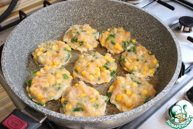 Ещё можно назвать их куриными котлетками. Но куриные оладьи мне нравится больше. Готовлю я их с добавлением зелёных стрелок чеснока и консервированной кукурузы. Стрелки чеснока придают блюду невероятный аромат, а кукуруза делает оладьи пёстрыми. Получается вкусный и простой ужин.
